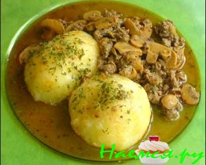 Из пюре,яйца,измельчённых сухих булочек( измельчённых сухарей), 50 гр муки, немного соли, немного мускатного ореха-замесить тесто. Сформировать шарики( если будет прилипать , то руки мочить). Воде дать закипеть, посолить .Положить в воду кнодели, после как закипят , убавить и варить 20 минут.Шумовкой достать из воды и дать воде хорошо стечь.
