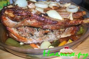 затем начинить мясо,свверху смазать мёдом и в духовку