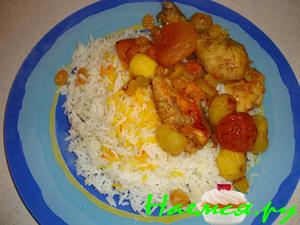 Обжарить на сливочном масле до золотистого цвета нарезанный лук, выложить туда же распаренный кишмиш, прожарить 3-4 минуты и добавить вишню, очищенную от косточек. Посолить поперчить и осторожно перемешать с мясом. Довести до готовности на слабом огне около 0,5 часа.
