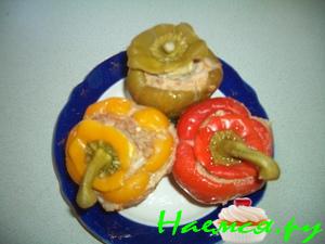 нафаршировать перцы,уложить в казанок/кастрюльку ,залить водой,тем временем сделать зажарку на растит.масле из моркови, лука и томат.пасты,посолить ,поперчить,добавить сметану.