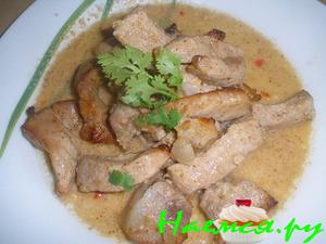 Ломтики свинины натираем горчицей и обжариваем на сильно разогретой сковороде по 3 минутки, добавляем соль, перец и наш готовый лучек, перемешиваем и добавляем сметану, если соус покажется густоватым после того как закипит, добавьте немного сливок или молока и тушите на медленном огне минут 40.