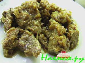 Добавить к свинине порезанный лук и обжарить все вместе. ЛУк должен стать золотисто-коричневым.