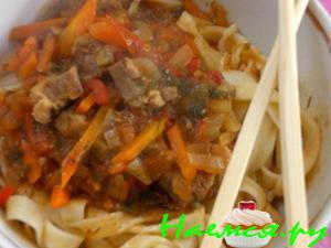 Лапшу готовить, отдельно и добавлять перед подачей. Муку соединить с водой, прибавить соль, замешать крутое тесто и придать ему форму колбаски. Смазав поверхность теста маслом и накрыть, чтоб не засохло. Для соуса: Морковь, лук, помидоры режим полукольцами, сладкий перец соломкой, чеснок мелко крошим. На сковороду выкладываем морковь, потом лук,перец, помидоры и чеснок. обжарить в масле. Выложить всё в кастрюлю в которой будете готовить. Мясо нарезать не большими кубиками и обжарить с не большим кол-вом соли, мёдом и молотым перцем до корочки и добавить к овощам. Залить все мясным бульоном (водой), посолить, поперчить по вкусу, добавить хмели-сунели и довести до кипения. После опустить в соус нарезанный кубиками картофель и тушить до готовности в течение 25-30 минут на медленном огне. Пока соус готовится раскатать тесто для лапши. Нарезать. Отварить лапшу в подсолённой воде, выложить в дуршлаг и промыть холодной водой, затем разделив на порции выложить каждую порцию в глубокую тарелку, залить соусом и посыпать рубленой зеленью петрушки или сельдерея.