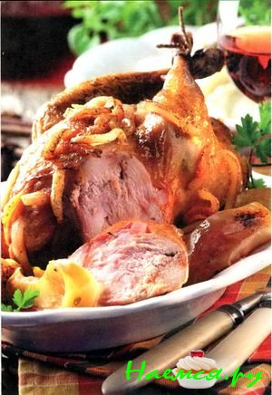 На разогретую сковороду положить тушку и обжарить до золотой корочки, придать бульон, вино и оставить на маленьком огне тушиться.