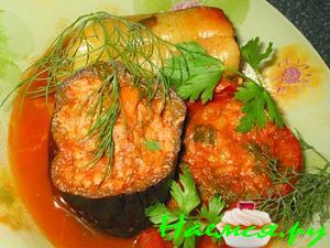 Пока мясо готовится обработать овощи. Баклажаны надрезать с одной стороны и опустить в кипящую воду на 5-10мин, вынуть, отжать, посолить и прожарить с двух сторон в масле. У перцев и помидоров очистить середину.