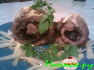 Мясо нарезать брусочками, сложить "колодцем", полить соусом