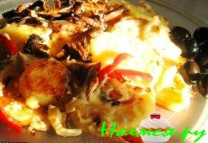 Залить поджарку яичной смесью, сверху положить кусочек сливочного масла и поставить в духовку на минут 15 на средний огонь.