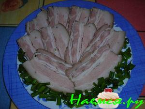 Грудинку обмыть, просушить, сделать вертикальные надрезы натереть маринадом и замариновать.Лук разломать на ломтики и тоже вместе с мясом замариновать.