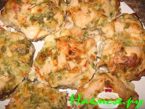 Куриный фарш или филе мелко режем, 2 ст. ложки сметаны, 2 яйца, 2 зубчика чеснока, сыр.