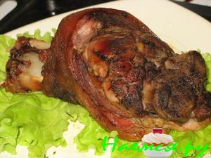 1.Берем свиную голенку,аккуратно срезаем шкурку и вырезаем косточку,шпигуем чесноком.