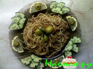 Макароны отварить, заправить оливковым маслом и перемешать с мясом.