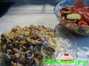 Все ингридиенты должны лежать на столе готовыми на сковороду!Блюдо готовится быстро и нужно успеть сделать соус и не переварить спагетти!