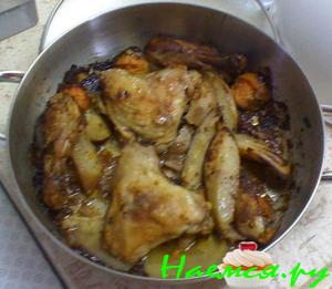 Тем временем гречку отварить 5 минут и выложить к курице, смазать майонезом, чтоб не пересохла.