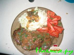 Перец горошком растолочь в ступке и обвалять кусок говядины,посолив.Кусок уложить на раскалённую сковородку и обжарить до готовности.В качестве гарнира в данном случае использовала обжаренные овощи:помидор и кабачок!
