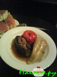Из баранины с репчатым луком приготовить фарш, при непрерывном помешивании обжарить в масле. В фарш добавить нашинкованную зелень, перец и корицу, все тщательно перемешать. Готовым фаршем начинить заранее подготовленные баклажаны(баклажаны очистить, положить в подсоленную холодную воду, нагреть до кипения и бланшировать 1-2 минуты),помидоры(ложечкой акуратненько удалить мякоть),перчики(удалить семена и чуть чуть обжарить в масле) и картофель, сложить в сотейник, залить небольшим количеством воды или бульона,куда добавляем мякоть помидоров и тушим при закрытой крышке. При подаче сверху заливают этим же соусом. Отдельно подают мацони ,можно с чесночком.
