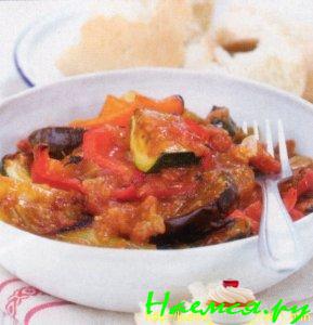 Разогреть в большой кастрюле 6 ст л оливкового масла, добавить 1 зубчик чеснока, мелко порезанный, 6 маленьких баклажанов (или 1 большой), порезанных пополам и 1 луковицу фенхеля, порезанную на дольки. Готовить около 5 мин до мягкости. Добавить 2 цуккини, порезанные большими кусками, 1 красный и 1 оранжевый перец, очищенный и мелко порезанный, и 1 луковицу, порезанную на дольки. Готовить около 3 мин.