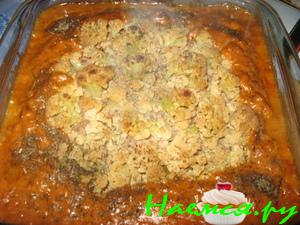 Картофель вiложить в форму,посолить,начинить фаршем и выложить сверху пассированые овощи.