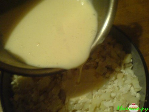 Взбить яйца с солью и молоком, залить картофель с брынзой.