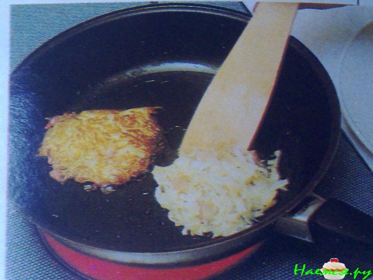 Нагреть в сковороде 2 ст. л. растительного масла, положить в него ложку картофельной смеси и слегка приплюсните тыльной стороной вилки.
