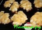 Если я готовлю обычный домашний обед - то укладываю кусочки мяса внахлест, если же готовлю праздничный обед - то кусочки кладу одтельно, на каждый кусочек сверху укладываю помидорку, а потом уже поливаю майонезом (опять-таки каждый кусочек отдельно и обильно). Получается красиво и кусочек легко класть на тарелку. А когда гостей собирается очень много, то на противень все укладывается слоями: лук, сыр, мясо, специи, лук, сыр, мясо, специи и майонез.