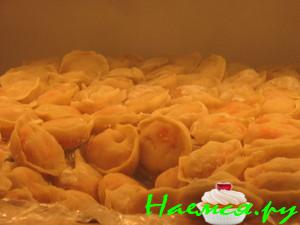 Замесить обыкновенное лапшовое тесто на воде и с яйцом и раскатать толщиной около 2-3 мм. Разрезать с помощью чашки на круги диаметром 7 см. Выложить в них чайную ложку готового фарша и защипнуть, начиная с одного конца придавая специфическую форму (второй конец лучше оставить открытым, чтобы в процессе варки тесто не лопалось).