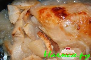 Потом уложить на блюдо для выпекания. Яблоки порезать кубиками, удалив косточки. Уложить яблоки по бокам курицы и сверху залить вином и небольшим количеством воды (150 гр.).