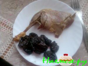 Т.к. курочка подавалась сразу к употреблению, мне не было смысла возиться с плоским красивым блюдом; я эту красавицу аккуратно вывернула в любимую пластмассовую миску, не потеряв при этом ни капли драгоценного сока; в ней же разделала и разложила по тарелкам, полив все тем же соком и разложив фруктовое пюре....