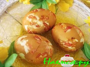 Утром в воду с луковой чешуёй положить яйца ( я брала яйца красные).Красные яйца после окрашивания луковой чешуёй более яркие, чем белые. Поставить на огонь и после закипания варить 15 минут. После того как яйца сварятся, промыть их под холодной водой, дать остыть. Потом яйца украшаем термо-обёрткой ( инструкция на упаковке).Термо-обёртки продаются в супермаркетах.