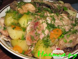 Блюдо залить майонезно-чесночной смесью, добавить 1 стакан воды. Накрыть всё фольгой запекать в духовке 1 час при температуре 200 градусов.