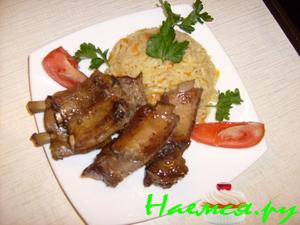 Полоску ребрышек молодой свинины помыть,обсушить салфеткой и натереть выжатым чесноком,тмином,приправой для свинины,хмели-сунели,солью,перцем.Телятину пропустить через мясорубку,добавить все приправы и хорошо вымесить.Взять большой кусок алюминиевой фольги,на нее положить ребрышки,той стороной,где было мяско вверх,фарш скатать шариком и завернуть в ребрышки.Все это сооружение поставить вертикально,т.е. должно получиться-забор из ребрышек,а внутри фарш.Обвязать ниткой,завернуть в фольгу и поставить в горячую духовку 180С на 1,5 час. Подать на большом блюде-дно устелить салатными листьями,на них поставить "Пенек",посыпать его мелко резанной кудрявой петрушечкой-мох,сверху накидать немного клюквы,а рядышком пристроить грибочки.А опушку леса из других блюд Вы соорудите сами.С Новым Годом!