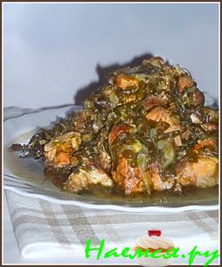 Нарезать кусочками по 30-40гр.,Зелень порезать не очень мелко.Орехи поджарить на сухой сковороде.Все уложить в кастрюльку добавить соус,сок лимона,масло,все помешать и оставить на часик отдыхать(мариноваться).