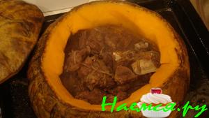 Теперь в глубокую сковородку наливаем немного воды, устанавливаем тыкву и ставим в разогретую духовку на 220% градусов примерно на час (зависит от размеров тыквы). Через это время открываем фольгу и допекаем мясо до зарумянивания.
