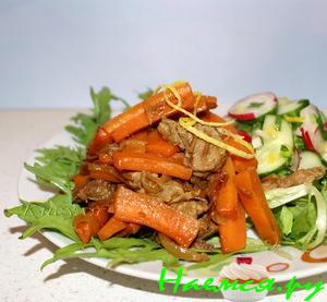 Мясо нарезать небольшими кусочками,добавить приправу и обжарить на растительном масле при сильном огне минут 15,трем на терке сыр делим его на две части.Помидоры режем кружочками и выкладываем по всему дну формы в которой будем запекать,слегка смазываем их майонезом.Затем выкладываем мясо,на него натертую на крупной терке морковь смешанную с половиной сыра,покрываем легкой сеточкой майонеза,следующий слой лук-майонез.Зелень порубленную смешиваем с оставшимся сыром и порезанными колечками оливками и равномерно распределяем по всей поверхности.Ставим в разогретую до 180-200гр духовку,и запекаем минут 50-60.Кушайте на здоровье!