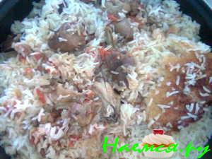 Засыпать рис к мясу и овощам,перемешать хорошенько и оставить рис(без воды) на 5 минут,периодически помешивая,чтобы рис впитал в себя масло.