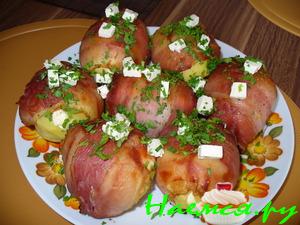 Картофель отварить в мундире,почистить,смазать маслом(пока теплая),обернуть беконом и закрепить зубочистками,довести в духовке до готовности.