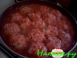 Фарш хороженько перемешать с солью перцем и рисом, сформовать шарики (рамером с куриное яичко),