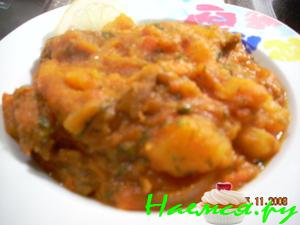 Добавить томат или разведенную томатную пасту и не перемешивая тушить до готовности. (Количество жидкости не должно покрывать полностью капусту, т.к. овощи еще пустят сок).