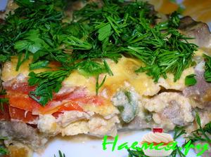 На противень выложить слой языка,слой картофеля(посыпать специями),залить сметаной,посыпать сыром