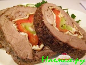 Все перемешать аккуратно и выложить на мясо ,сверху майонез,и тертый на мелкой терке сыр.Запекаем в духовке до готовности минут 15 при температуре 180 градусов.