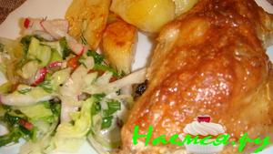 Выложить на протвень ножки и крупно порез. картошку. Полить еще раз все кефиром и в духовку при темпер. 180-200 гр. на 35-45 минут