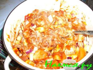 в кастрюлю сложить мелко нарезаные коренья , залить водой и проварить до гатовности.гатовый бульён слить в миску,варёные овощи измельчить в блендоре и снова залить бульёном. помидоры и перец обжарить в раст.масле и также положить в кастрюлю. курицу нарезать на небольшие куски,обжарить и отправить к овощам,тушить. при подаче приправить мелко нарезаным чесноком,украсить помидорами и зеленью.ням-ням
