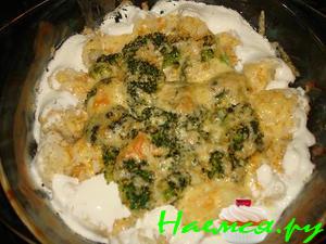Кабачки нарезать полукружками , обвалять в муке и обжарить на растительном масле до золотистого цвета. Рис прмыть и обсушить, не варить. Обжарить сырой рис на растит. масле до слегка золотистого цвета, добавить мелко нарезанный лук. Немного обжарить и добавить нарезанные мелкими кубиками перец и помидоры. Всё вместе обжарить, посолить, приправить. В противень или форму уложить слой кабачков, затем рис с овощами, разровнять, сверху снова слой кабачков. Влить около 1 стакана горячей воды, но чтобы верхний слой вода не покрывала. Затем взбить яйца со сметаной и залить запеканку. Поставить в духовку на средний огонь и запекать до готовности риса. У меня это заняло почти 50 мин. За несколько мин до готовности посыпать тертым сыром.
