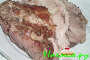 порезать лук и чеснок. положить на мясо. можно завернуть кусок рулетом.