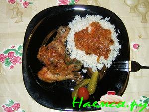 Внутренний жир, нарезать на кубики и растопить в казане, обжарить в жиру кусочки курицы до красивой розовой корочки, добавить лук, огонь не уменьшать, обжаривать, помешивая 10мин,перец, тушить помешивая 10 мин. Выложить сверху картофель и влить отвар не более 5 столовых ложек. Хорошо перемешать. Тушить под закрытой крышкой 35 мин на медленном огне.