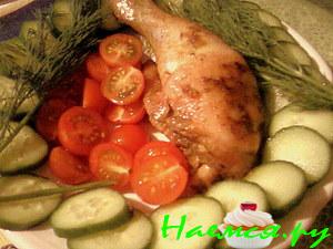 Делаем маринад:В воду добовляем приправы.Колличество приправ по вкусу.Я люблю побольше приправы для курицы.И всё перемешиваем.(можно добавить немножко уксуса,но это уже на ваш вкус).Голень выкладываем в сковороду и заливаем маринадом.Закрываем крышкой,ставим на плиту и тушим около 30 минут.Курочка получается очень ароматной!