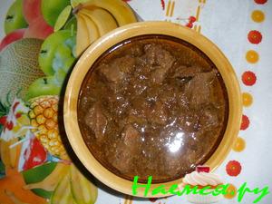 Говядину - мякоть нарезать на небольшие кусочки. Помыть Лук нарезать кубиками и положить вместе с мясом в кастрюлю с маслом. Обжарить часто помешивая.минут 15-20. Посолить поперчить или бросить горошковый перец чёрний добавить пару листьев лавровых и залить водой столько, чтобы слегка покрыть мясо. Варить накрыв крышкой (тушить) на небольшом огне, до готовности мяса. Если мясо уже мягкое а жидкости много осталось то прибавляете огонь чтобы жидкость исспарилась. Жидкости должно остатся совсем мало, оно должно покрывать дно кастрюли. Подавать можно по разному,по вкусу и картошкой,и макароми и т.д.Наши любят с макаронами.