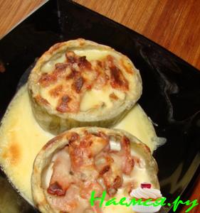 В сотейник выложить "стаканчики",между ними картофель-кубиками.