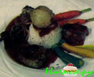 Для соуса нашинкованные морковь и луковицу пожарить на жире до золотистого цвета, добавить томат-пюре, небольшое количество воды, заправить солью, перцем и потушить при закрытой крышке 35-40 минут. При подаче подлить приготовленный соус, оформить зеленью.
