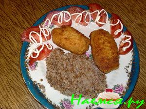 Скатать маленькую вытянутую котлетку, обмакнуть ее в яичный белок, затем обвалять в панировочных сухарях.