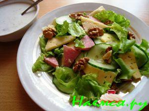 листья салата порвать руками на не очень крупные куски и разложить по порционным тарелкам, очищенный вареный картофель нарезать, нарезать помидоры и огурцы, все овощи разложить по порционным тарелкам сверху на листья салата, уложить к овощам вареные сосиски. Приготовить соус - 3-4 ст.л.майонеза смешать с 2 измельченными зубчиками чеснока, щепоткой сушенной мяты, хорошенько перемешать и полить разложенные по тарелкам овощи.